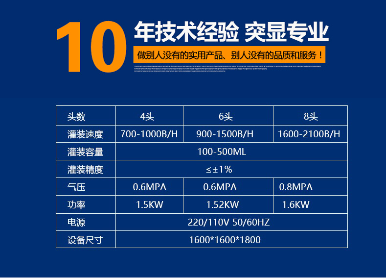 設(shè)備型號 | 灌裝速度 | 灌裝容量 | 灌裝精度 | 氣壓 | 功率 | 電源 | 設(shè)備尺寸 |