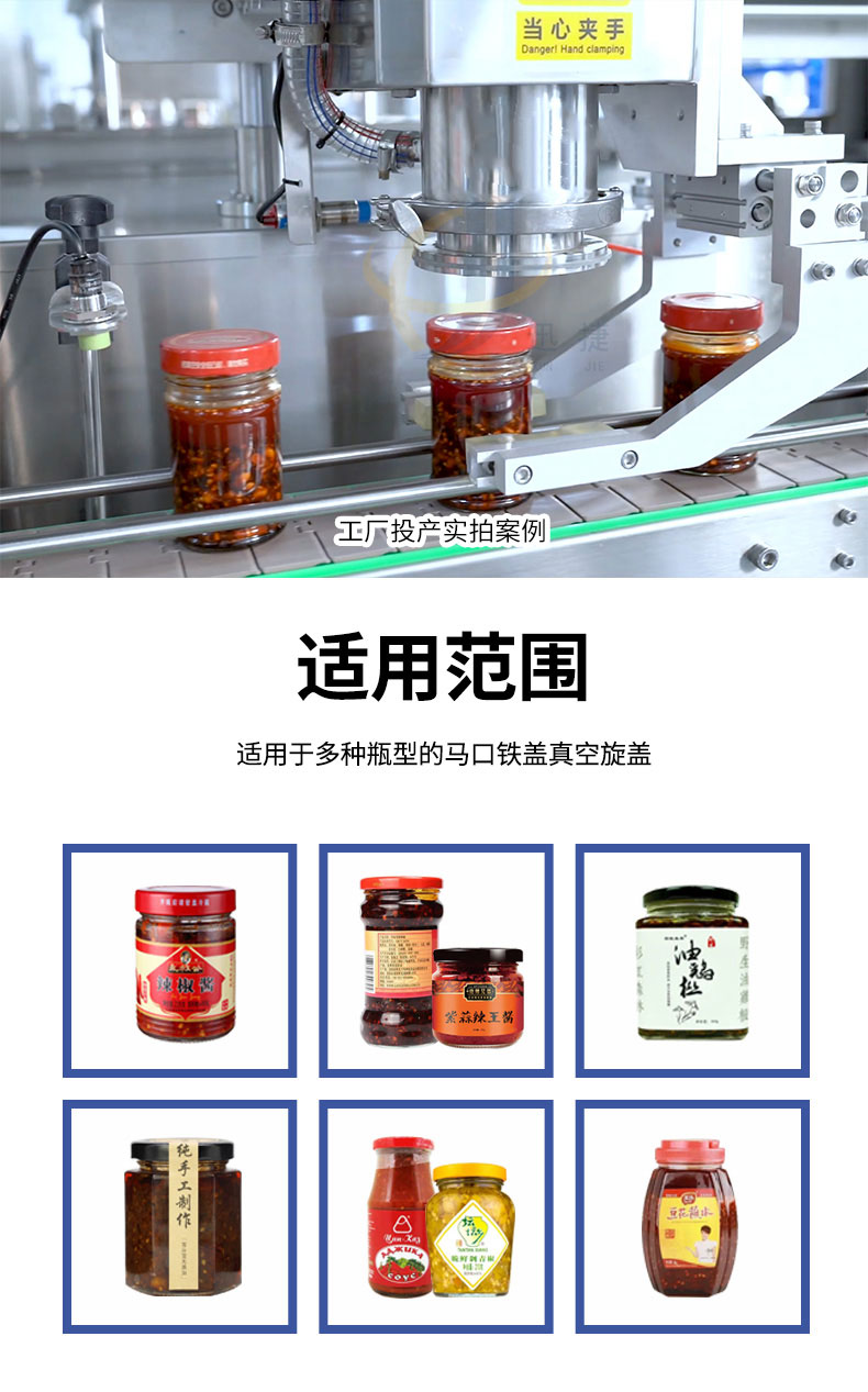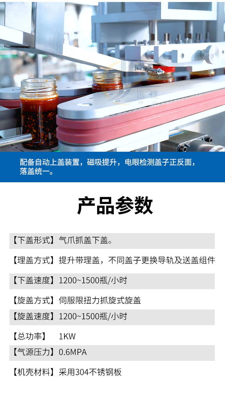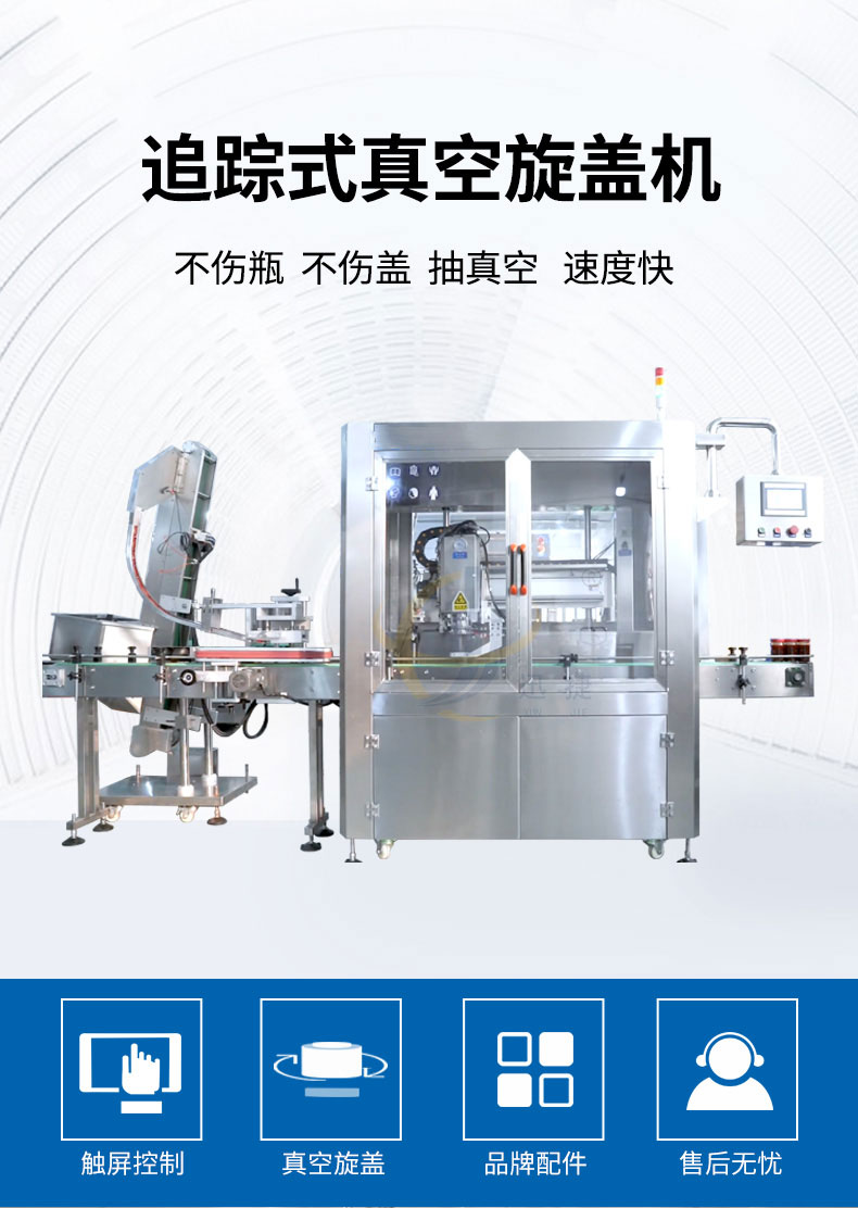 跟蹤式真空旋蓋機(jī)適用于多種瓶型的馬口鐵蓋真空旋蓋。設(shè)備由PLC結(jié)合觸摸屏控制,采用世界知名品牌電器和氣動(dòng)元件,故障率低。