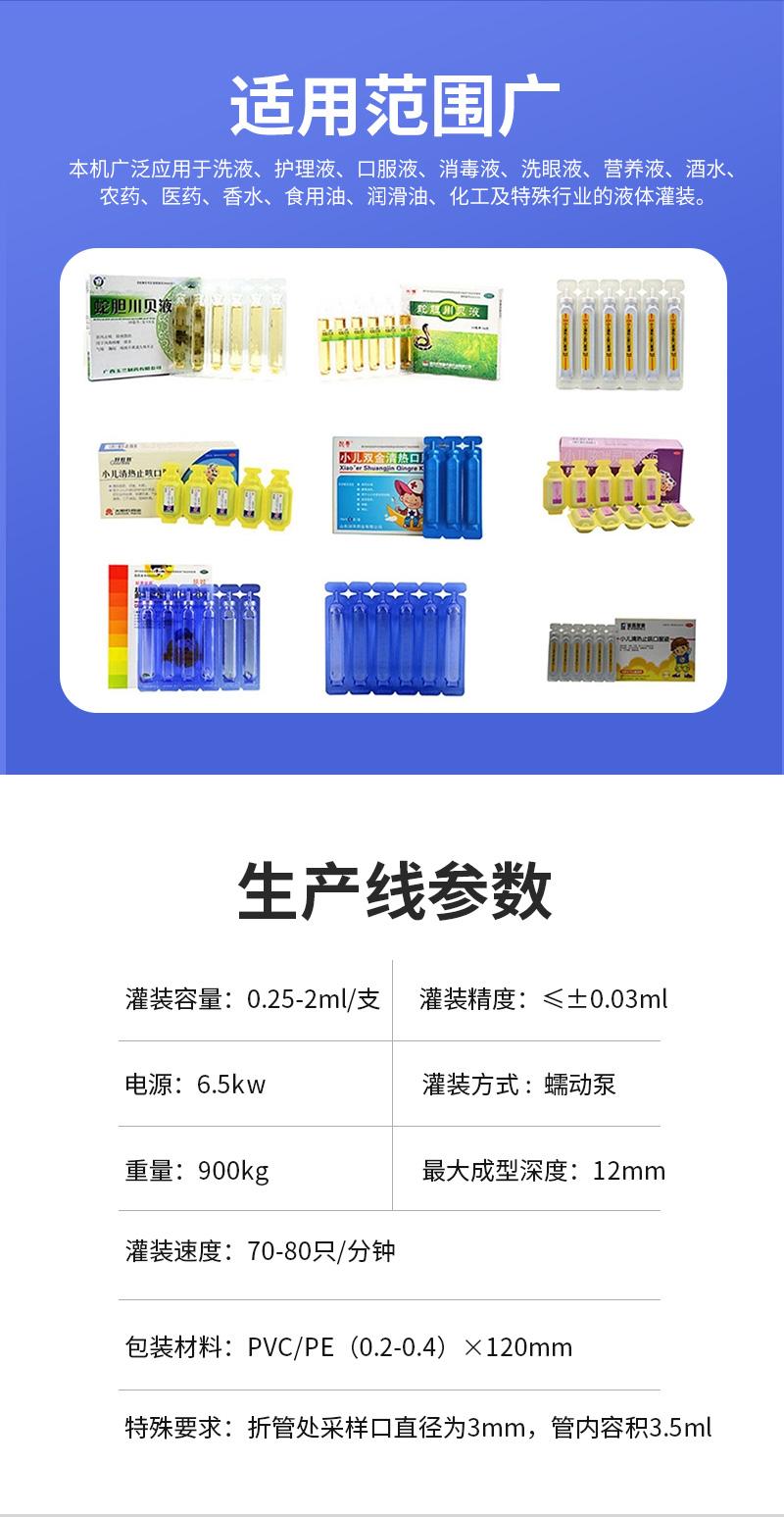 易折試劑管成型灌裝機廣泛使用于護理液、口服液、洗眼液、營養(yǎng)液、香水、食用油、潤滑油、化工及特殊行業(yè)的液體灌裝。