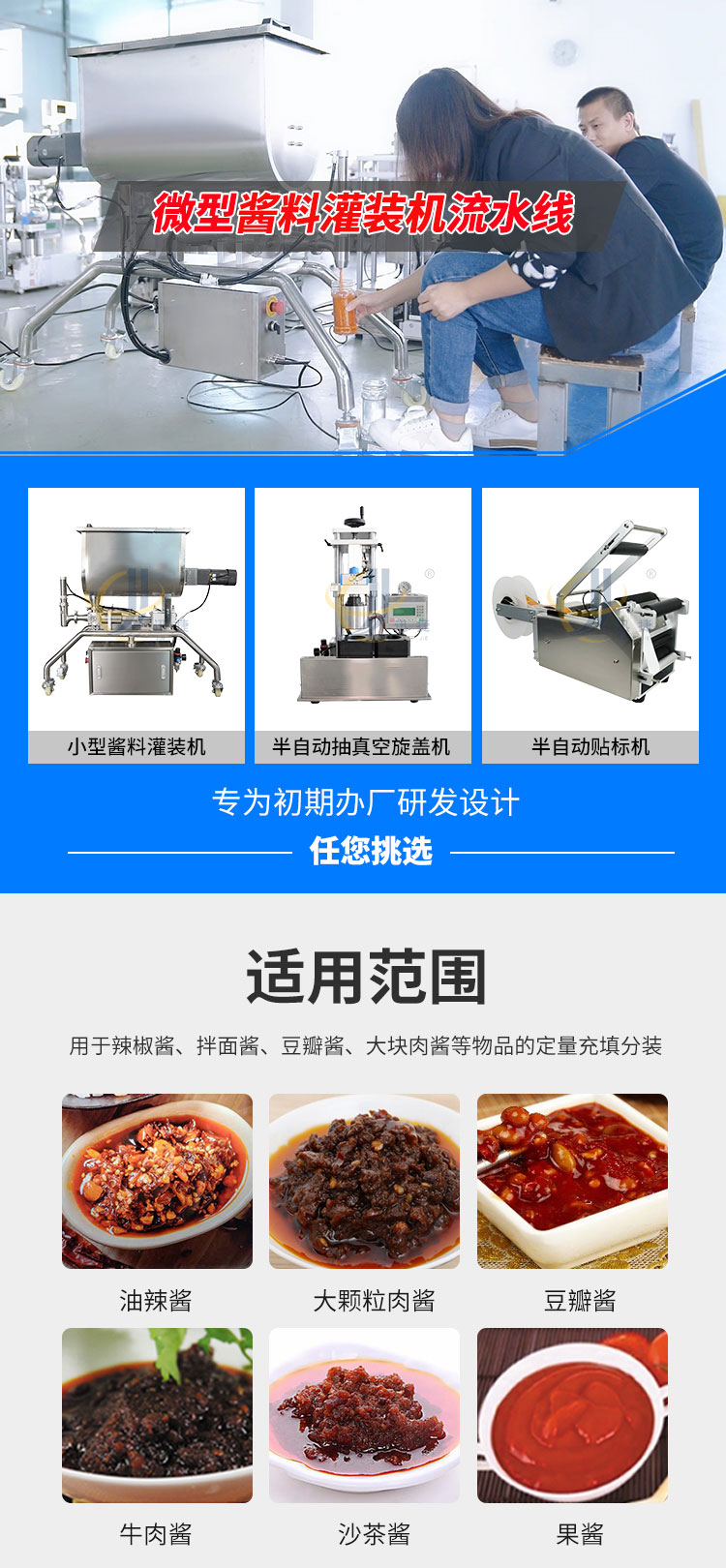 小型醬料灌裝生產(chǎn)線又名醬料灌裝三劍客,由半自動(dòng)醬料灌裝機(jī)+半自動(dòng)真空旋蓋機(jī)+半自動(dòng)圓瓶貼標(biāo)機(jī)組合而成。該灌裝機(jī)適用于辣椒醬、豆瓣醬、大塊肉醬等物品的定量充填分裝。