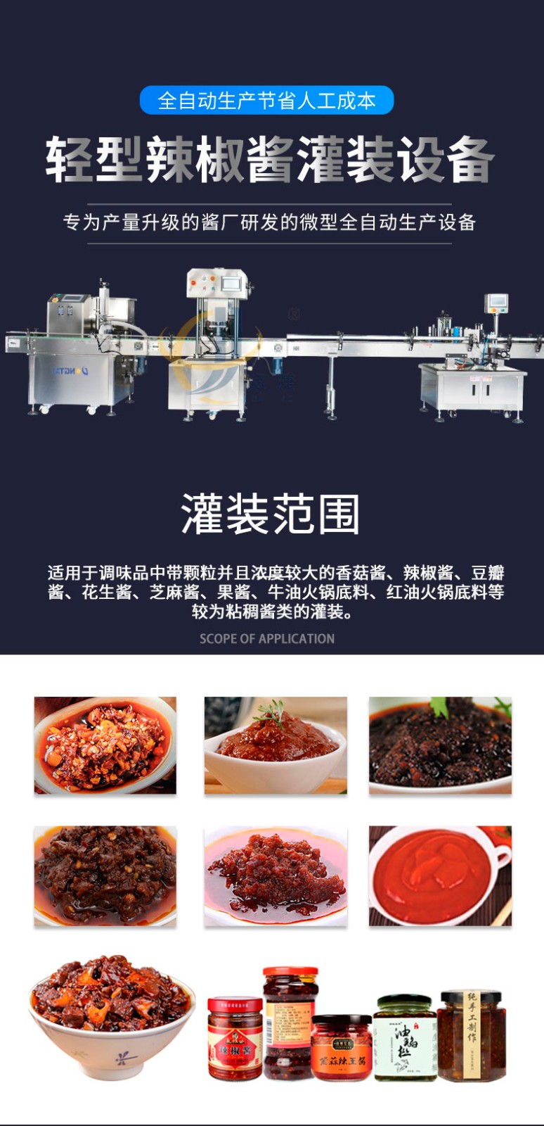 輕型辣椒醬灌裝生產(chǎn)線適用于調味品中帶顆粒并且濃度較大的香菇醬、辣椒醬、豆瓣醬、花生醬、芝麻醬、果醬、牛油火鍋底料、紅油火鍋底料等較為粘稠醬類的灌裝。