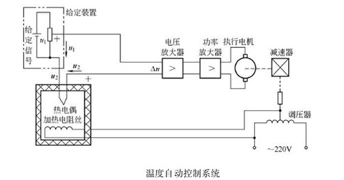 如果將控溫過程中的人工操作 (檢測(cè)和調(diào)節(jié)) 換由自動(dòng)控制裝置完成,則成為包裝機(jī)自動(dòng)控溫系統(tǒng)。如下圖所示,檢測(cè)元件熱電偶檢測(cè)恒溫箱內(nèi)的溫度,并將溫度轉(zhuǎn)換為對(duì)應(yīng)的電壓信號(hào)2 ,同時(shí)反饋給比較器。比較器比較表示給定溫度的給定電壓信號(hào)1與檢測(cè)電壓信號(hào)2的大小,得到溫差信號(hào),其大小和正負(fù)代表溫差的大小和方向。溫差信號(hào)△經(jīng)電壓放大和功率放大后,控制執(zhí)行電機(jī)的轉(zhuǎn)速和方向,執(zhí)行電機(jī)通過傳動(dòng)裝置拖動(dòng)調(diào)壓器觸頭調(diào)節(jié)供熱電壓。當(dāng)溫度偏高時(shí),動(dòng)觸頭向著減小電壓( 電流)方向轉(zhuǎn)動(dòng); 反之,當(dāng)溫度偏低時(shí),動(dòng)觸頭則向著增大電壓( 電流)方向運(yùn)動(dòng),直至恒溫箱內(nèi)溫度達(dá)到給定溫度,溫差信號(hào)△=0 時(shí)觸頭停止運(yùn)動(dòng)。