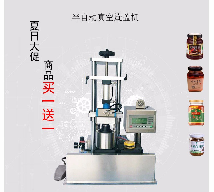 這款小型辣椒醬封口機(jī)主要用于食品包裝,采用標(biāo)準(zhǔn)馬口鐵爪式旋開(kāi)蓋封口的玻璃瓶包裝??蓪?shí)現(xiàn)的功能是抽吸包裝容器內(nèi)的空氣使其達(dá)到設(shè)定的負(fù)壓值(即抽真空),然后旋緊蓋子。 為半自動(dòng)機(jī)型,即人工進(jìn)出瓶,人工配蓋,其他過(guò)程自動(dòng)。